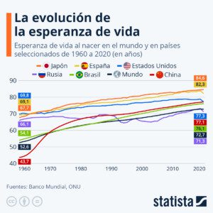 El país con la esperanza de vida más alta del mundo es Japón, con una media de casi 85 años para todos los sexos y España lo sigue de cerca con algo más de 82 años. En cuanto a Brasil, la esperanza de vida es de 76 años y Estados Unidos y China comparten un promedio de 77 años. Por otra parte, en 2020, la esperanza de vida de los rusos se redujo en dos años como consecuencia de la pandemia y quedó por debajo de la media mundial (72,7 años). Teniendo en cuenta las tendencias actuales (incluyendo los efectos de la guerra en Ucrania), Rusia pronto podría ser superada por otros países emergentes, como la India.