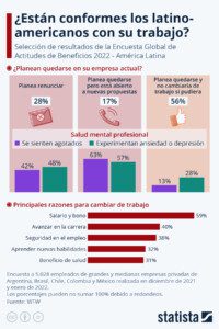 Según datos de la Encuesta Global de Actitudes de Beneficios – América Latina, realizada por la consultora WTW entre fines de 2021 y principios de 2022, un 56% de los empleados latinoamericanos consultados planea quedarse en su empleo actual y no cambiaría de trabajo si pudiera, frente a un 45% que está abierto a nuevas propuestas o planea marcharse. Los principales motivos que encuentra este segundo grupo para buscar nuevos rumbos son el salario (un 59%), avanzar en la carrera (40%) y obtener seguridad en el empleo (38%).