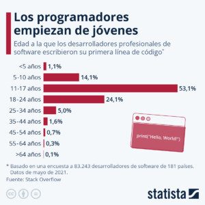 Según los datos de la encuesta de Stack Overflow a programadores, realizada en 2021 a más de 83.000 desarrolladores de software de 181 países, más de la mitad de ellos escribieron sus primeras líneas de código a muy temprana edad: entre los 11 y los 17 años (53%).
