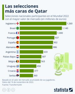 Este domingo  inició la Copa Mundial de la FIFA en Qatar. Durante el campeonato, 32 equipos de todo el planeta se enfrentarán para definir cuál de ellos se lleva a casa la copa más preciada del fútbol masculino. Muchos de los talentos más grandes de este deporte a nivel mundial saldrán a escena a demostrar sus dotes futbolísticas y a hacer valer las exorbitantes sumas que cobran por ejercer esta profesión. Un puñado de países llegarán al Mundial con equipos altamente valiosos, si se considera en conjunto el valor de mercado de sus miembros.